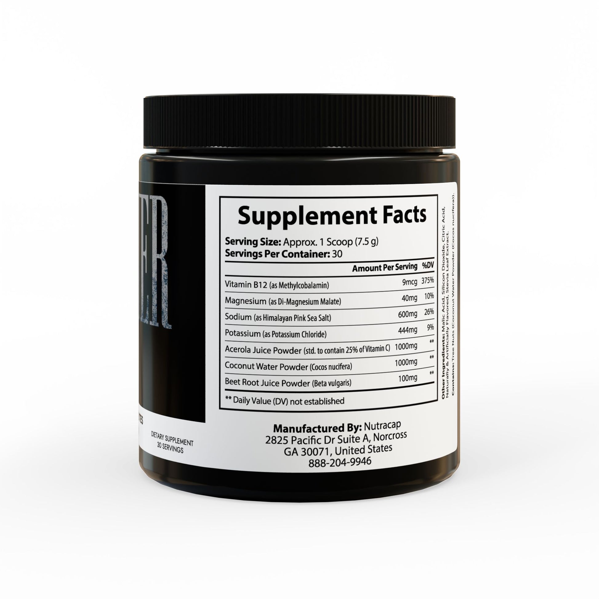 Key ingredients include Vitamin B12, Magnesium, Sodium (as Himalayan Pink Sea Salt), Potassium, Acerola Juice Powder (standardized to contain 25% Vitamin C), Coconut Water Powder, and Beet Root Juice Powder.